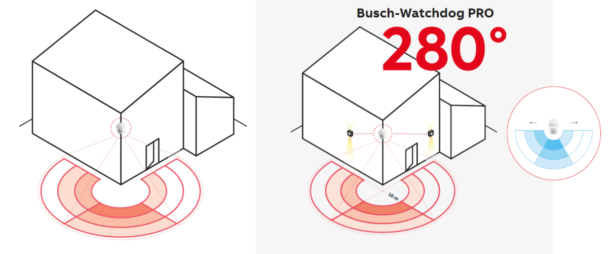 With the optional corner adapter, the Busch-Watchdog 280° can monitor two sides of a building. Additional features include ground and rear-field detection, creep-zone protection, and automatic light activation when stepping outside.